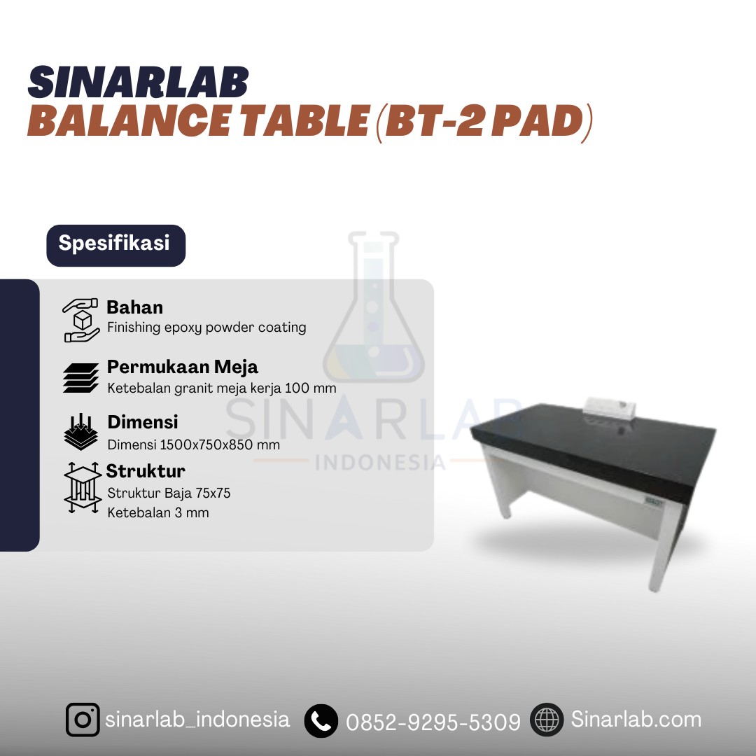 Balance Table atau biasa dikenal dengan meja timbang (BT-2 PAD) adalah meja kerja khusus yang dirancang di ruang laboratorium untuk memberikan kestabilan tinggi saat menimbang atau bekerja dengan alat yang presisi, biasanya dilengkapi bantalan atau pad untuk meredam getaran seperti mikroskop resolusi tinggi atau peralatan pengukuran kekentalan (viscometer). Meja ini sangat penting untuk memastikan hasil penimbangan yang akurat dan dapat diulang, dengan meminimalkan gangguan dari getaran lantai, gerakan operator, atau suara di lingkungan laboratorium. Meja ini sangat penting untuk menempatkan timbangan analitik (Analytical Balance) atau instrumen sensitif lainnya yang membutuhkan presisi tinggi.