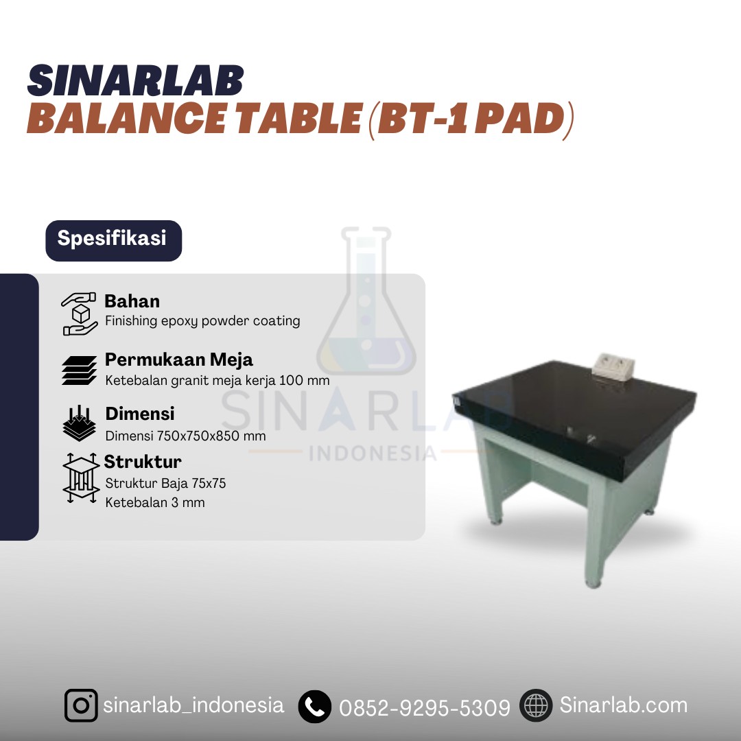 Balance Table (BT-1 PAD) adalah meja kerja khusus yang dirancang untuk menstabilkan alat timbangan atau peralatan presisi dengan bantalan peredam getaran, supaya hasil pengukuran jadi lebih akurat dan konsisten. Struktur meja yang kokoh (biasanya baja tebal anti-korosi) yang menopang seluruh beban dan berfungsi sebagai meja kerja umum. Biasanya dipakai di lab atau tempat kerja yang butuh ketelitian tinggi.