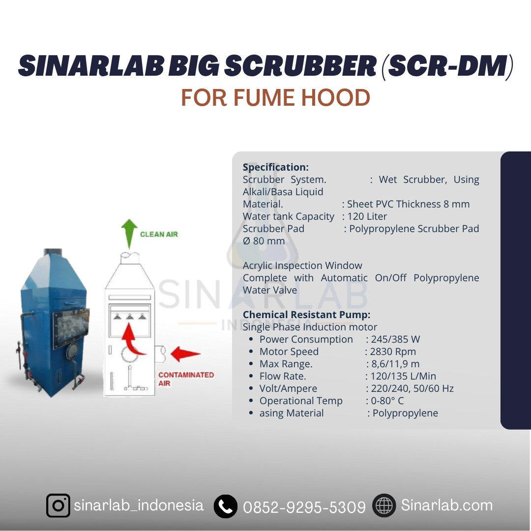 Big Scrubber (Scr-Bg) For Fume Hood adalah unit pembersih udara buangan laboratorium (biasanya jenis Wet Scrubber) yang berfungsi untuk menetralisir gas, uap kimia, dan partikel berbahaya yang dihasilkan dari proses kerja di dalam fume hood. Alat ini memiliki kapasitas dan dimensi lebih besar daripada scrubber standar atau Direct Mounted Scrubber (SCR-DM).