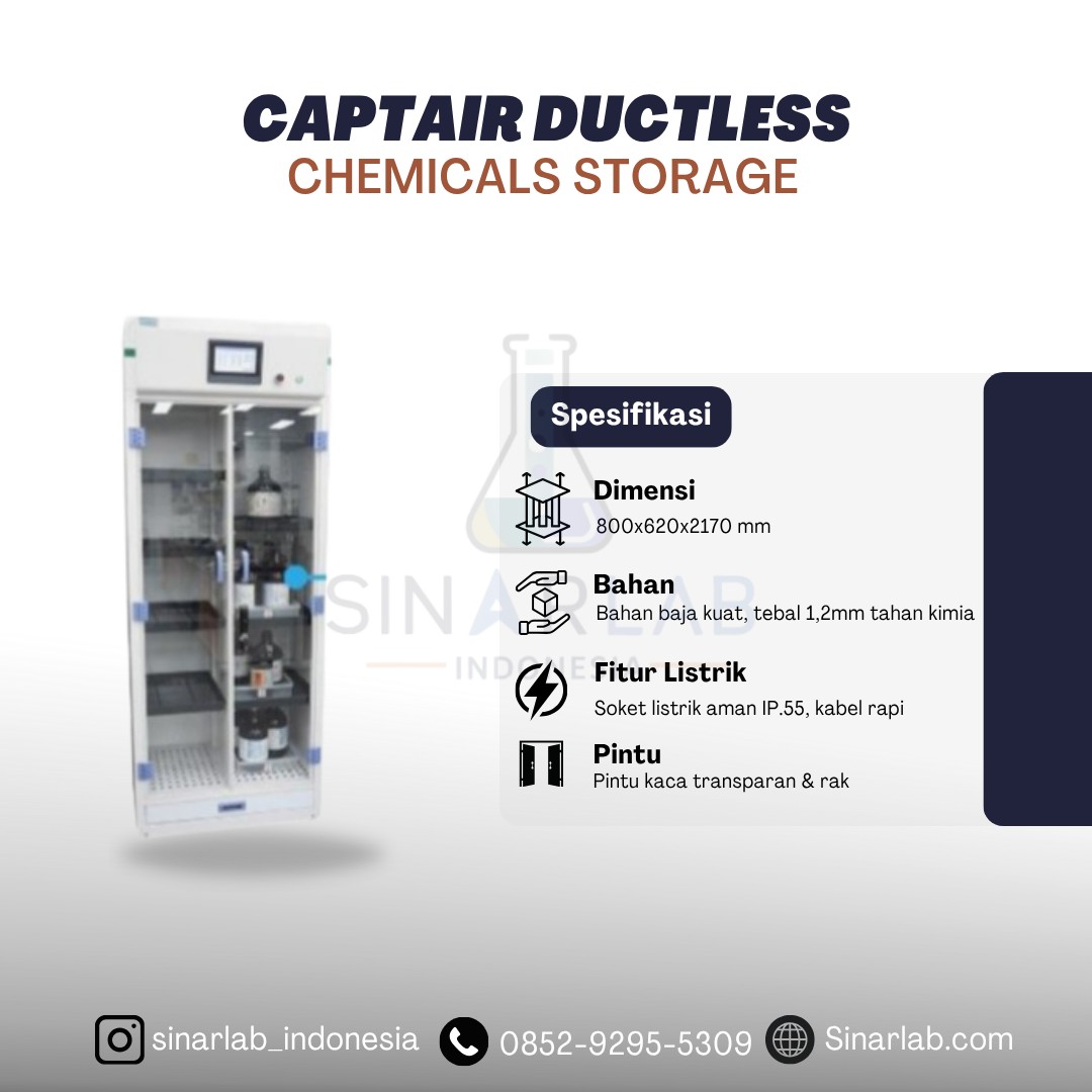 Captair Ductless Chemicals Storage adalah lemari penyimpanan bahan kimia yang dilengkapi sistem penyaring udara tanpa saluran pembuangan (ductless), yang dirancang untuk menyimpan dan melindungi bahan kimia berbahaya. Fungsinya menjaga bahan kimia tetap aman dan bau atau gas berbahaya tidak menyebar ke ruangan kerja. Keunggulan utamanya adalah kemudahan instalasi, portabilitas, dan efisiensi dalam ruang terbatas atau laboratorium tanpa akses ventilasi permanen.