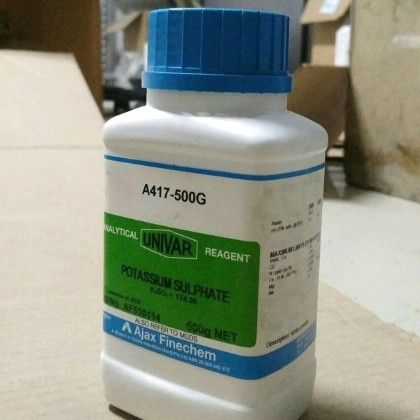 Potassium sulphate dalam nama ilmiah K2SO4, merupakan product analytical reagent Brand AJAX FINECHEM, Katalog A417-500g. Kami juga siap suply kimia jenis lain. Kami sering IMPOR.