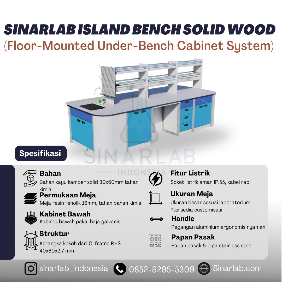 Island Bench Solid Wood (Floor-Mounted Under-Bench Cabinet System) adalah meja laboratorium tipe island dengan kabinet yang dipasang langsung ke lantai, memakai struktur kayu kamper solid 30×60 mm berlapis epoxy tahan bahan kimia. Worktop-nya resin fenolik tebal 16 mm tahan bahan kimia dan pelarut, cocok untuk kebutuhan lab yang butuh kekuatan dan ketahanan maksimal.
