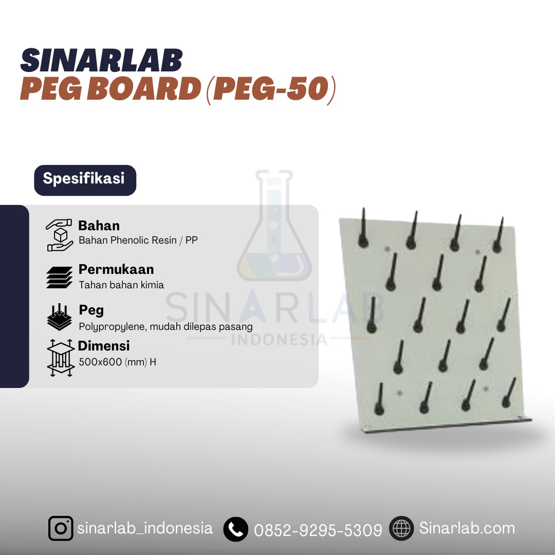 Peg Board (PEG-50) yang dikenal sebagai Drying Rack Glassware Laboratorium adalah papan berlubang rak pengering alat gelas laboratorium yang digunakan untuk menggantung alat atau perlengkapan seperti tabung reaksi, erlenmeyer, beaker, dan peralatan gelas lainnya setelah dicuci agar rapi dan mudah dijangkau, sering dipakai di laboratorium, atau ruang kerja. Biasanya lubangnya disesuaikan untuk memasang peg atau kait. Dengan material tahan bahan kimia dan desain vertikal hemat ruang, rak ini membantu menjaga kebersihan dan kerapian area kerja laboratorium.