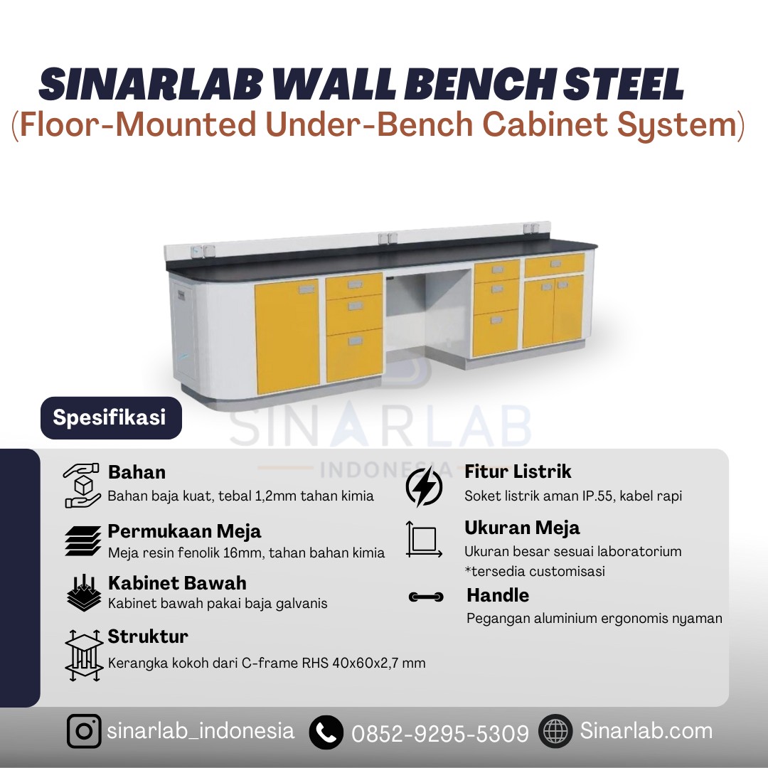 Wall Bench Steel (Floor-Mounted Under-Bench Cabinet System) adalah meja laboratorium dengan kabinet bawah yang dipasang langsung ke lantai untuk stabilitas ekstra. Meja ini dibuat dari bahan baja tebal dengan permukaan meja dari resin fenolik yang tahan bahan kimia dan zat pelarut. Meja ini sangat cocok untuk kerja di ruang laboratorium yang membutuhkan ketahanan, kebersihan, dan keamanan tinggi bagi pengguna dan lingkungan.